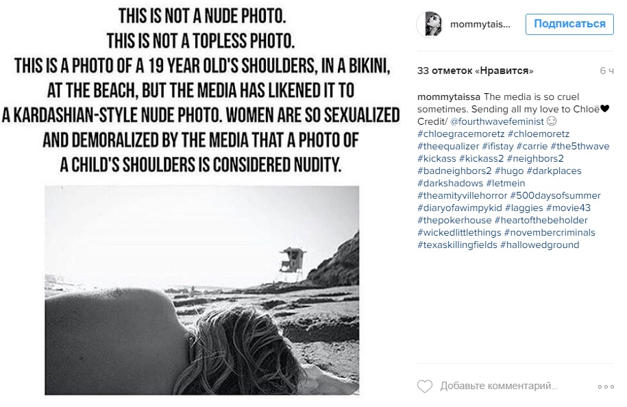 Хлою сравнили с Ким Кардашьян (35), которая просто обожает обнажаться перед камерой. Поклонников актрисы возмутили такие ассоциации, один из них сделал коллаж из фото Хлои и написал: «Это не обнаженное фото. Это не снимок топлес. Это плечи 19-летней девушки на пляже, но медиа причислили это к стилю обнаженных фотографий Ким Кардашьян. Докатились, девчачьи плечи воспринимают, как обнаженку».