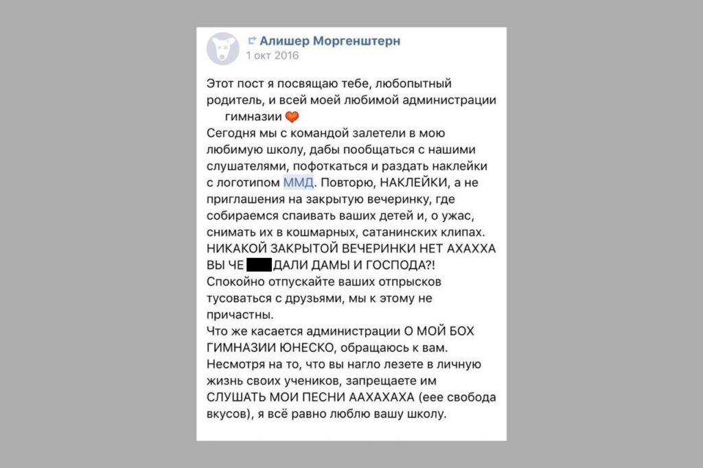 Учащаяся уфимской гимназии, в которой учился Моргенштерн, кстати, рассказала анонимно порталу VSRAP: в школьные времена он основал группу «Моя мама девственница», администрация гимназии запрещала их концерты, учеников, которые были замечены в одном из клипов, ставили на внутришкольный учет. В Сети даже есть скриншот поста со страницы Алишера «ВКонтакте», в котором он пишет: «Мы залетели в любимую школу, дабы пообщаться с нашими слушателями, пофоткаться и раздать наклейки с логотипом. Повторю, наклейки, а не приглашения на закрытую вечеринку, где собираемся спаивать ваших детей и снимать их в кошмарных, сатанинских клипах. Вы че, е@!#у дали, дамы и господа?»