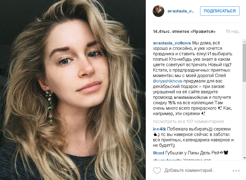 Фотограф Анастасия Волкова (360 тысяч подписчиков), по слухам, получает за один пост 50 тысяч рублей. Тут все зависит от качества контента и аудитории, на которую рассчитан твой профиль.