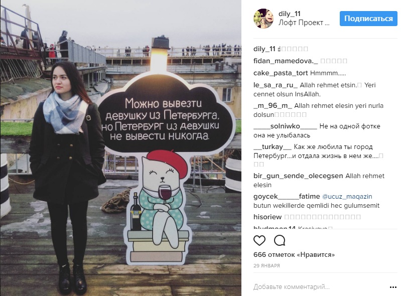 Друзья звали ее Дилей. Девушке было всего 20 лет, она училась в Петербургском госуниверситете путей сообщения (ПГУПС) на третьем курсе экономического факультета и просто обожала Санкт-Петербург. Ее Instagram пестрил видами ее любимого города. «Можно вывезти девушку из Петербурга, но Петербург из девушки не вывести никогда» — на фоне такой надписи Дильбара сфотографировалась пару месяцев назад.
