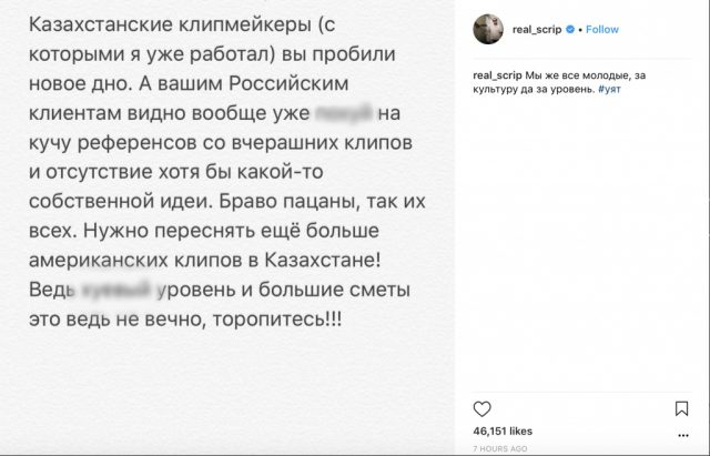 А в этот раз удар пришёлся по творчеству казахстанских клипмейкеров. Рэпер обвинил их в отсутствии собственных идей и воровстве их у американских артистов: «Казахские клипмейкеры (с которыми я уже работал) вы пробили новое дно. А вашим Российским клиентам видно вообще уже п** на кучу референтов со вчерашних клипов и отсутствие хотя бы какой-то собственной идеи. Браво пацаны, так их всех. Нужно переснять еще больше американских клипов в Казахстане!»