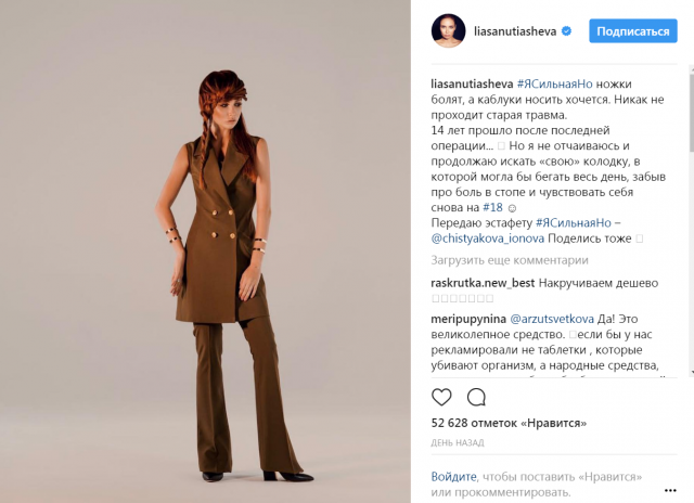 Ляйсан Утяшева (32) поделилась болью – из-за давней травмы стопы спортсменка не может носить каблуки: «Ножки болят, а каблуки носить хочется. Никак не проходит старая травма. 14 лет прошло после последней операции… Но я не отчаиваюсь и продолжаю искать «свою» колодку, в которой могла бы бегать весь день, забыв про боль в стопе и чувствовать себя снова на 18».