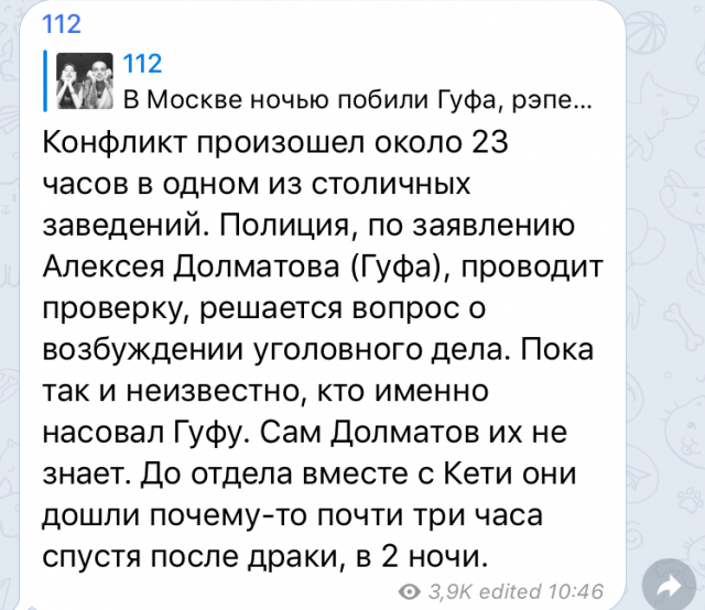Как сообщает Telegram-канал «112», полиция проводит проверку по заявлению. Кто именно и почему затеял драку – неизвестно. «Пока так и неизвестно, кто именно насовал Гуфу. Сам Долматов их не знает. До отдела вместе с Кети они дошли почему-то почти три часа спустя после драки, в 2 ночи», — пишут на канале. От госпитализации Долматов, кстати, отказался.