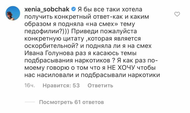 «Я бы все таки хотела получить конкретный ответ – как и каким образом я подняла «на смех» тему педофилии?))) Приведи пожалуйста конкретную цитату, которая является оскорбительной? И подняла ли я на смех Ивана Голунова раз я касаюсь темы подбрасывания наркотиков? Я как раз по-моему говорю о том, что я НЕ ХОЧУ чтобы нас насиловали и подбрасывали наркотики (орфография и пунктуация автора – прим. ред.)», — заявила Собчак.