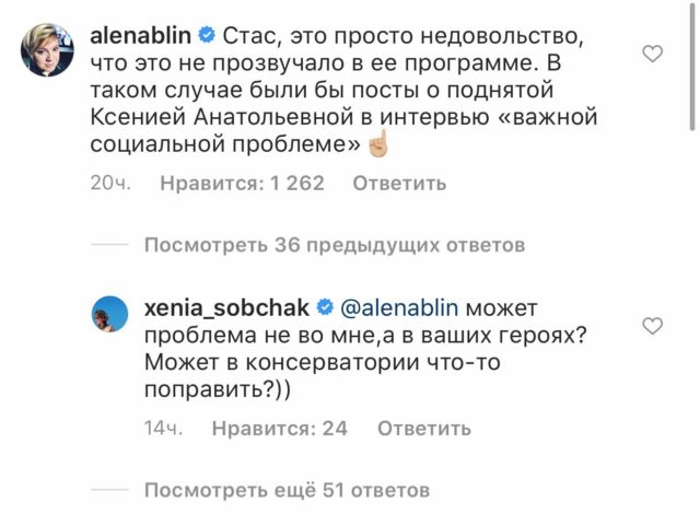 «Стас, это просто недовольство, что это не прозвучало в ее программе. В таком случае были бы посты о поднятой Ксенией Анатольевной в интервью «важной социальной проблеме (орфография и пунктуация автора – прим. ред.)», — написала Алена.