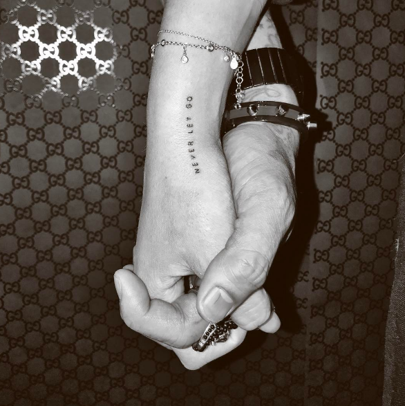 И вот, обновка – Never let go на правой руке. Набил эту татуировку ее любимый мастер Джон Вален, более известный под псевдонимом JonBoy, работающий в салоне West 4 Tattoo, к которому любят заглядывать Кендалл и Кайли Дженнер.