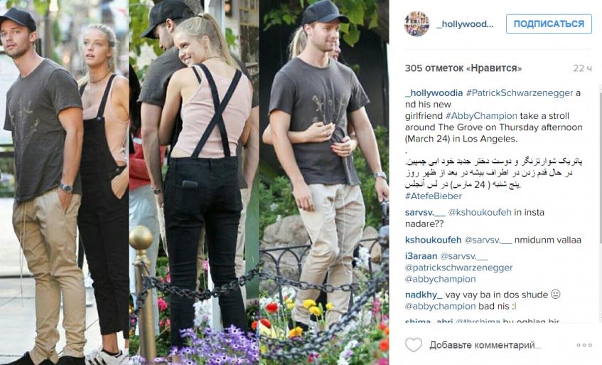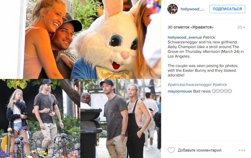Как ты помнишь, в прошлом году сын Арнольда Шварценеггера (68) Патрик (22) закрутил недолгий роман со скандальной певицей Майли Сайрус (23). Но эта пара оказалось непрочной. Всего через несколько месяцев певица и актер расстались, после чего Майли вернулась к своему бывшему возлюбленному — актеру Лиаму Хемсворту (26). В свою очередь, Патрик тоже не терял времени. В начале марта в Сети появились слухи, что юноша начал встречаться с моделью Эбби Чемпион (19). И, как оказалось, это правда. Недавно новоиспеченная пара официально перестала скрываться и теперь буквально на каждом углу демонстрирует свои чувства.