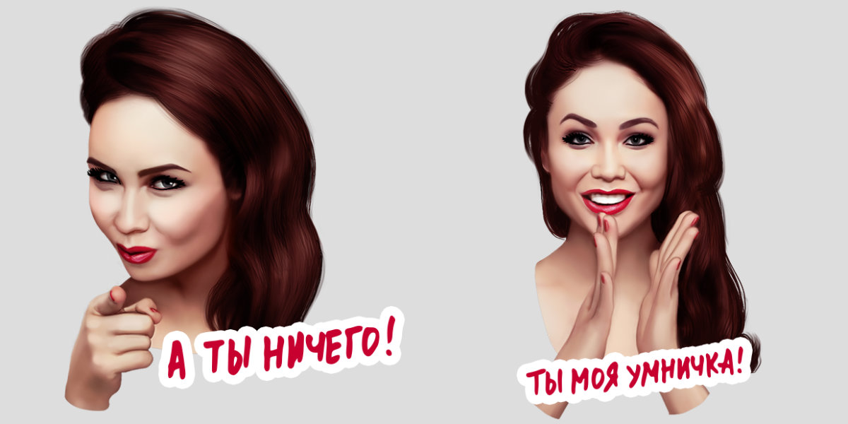 При поддержке проекта PeopleMoji (они взяли на себя всю техническую часть и работу с художниками) стикеры получились яркими и очень эмоциональными! «Художники тщательно отрисовывали стикеры, и, мне кажется, нам удалось передать даже мельчайшие детали мимики. Цитаты мы выбирали вместе с Пашей – хотелось, чтобы, читая фразу, человек сразу представлял, как мы ее произносим», — рассказывает Ляйсан.