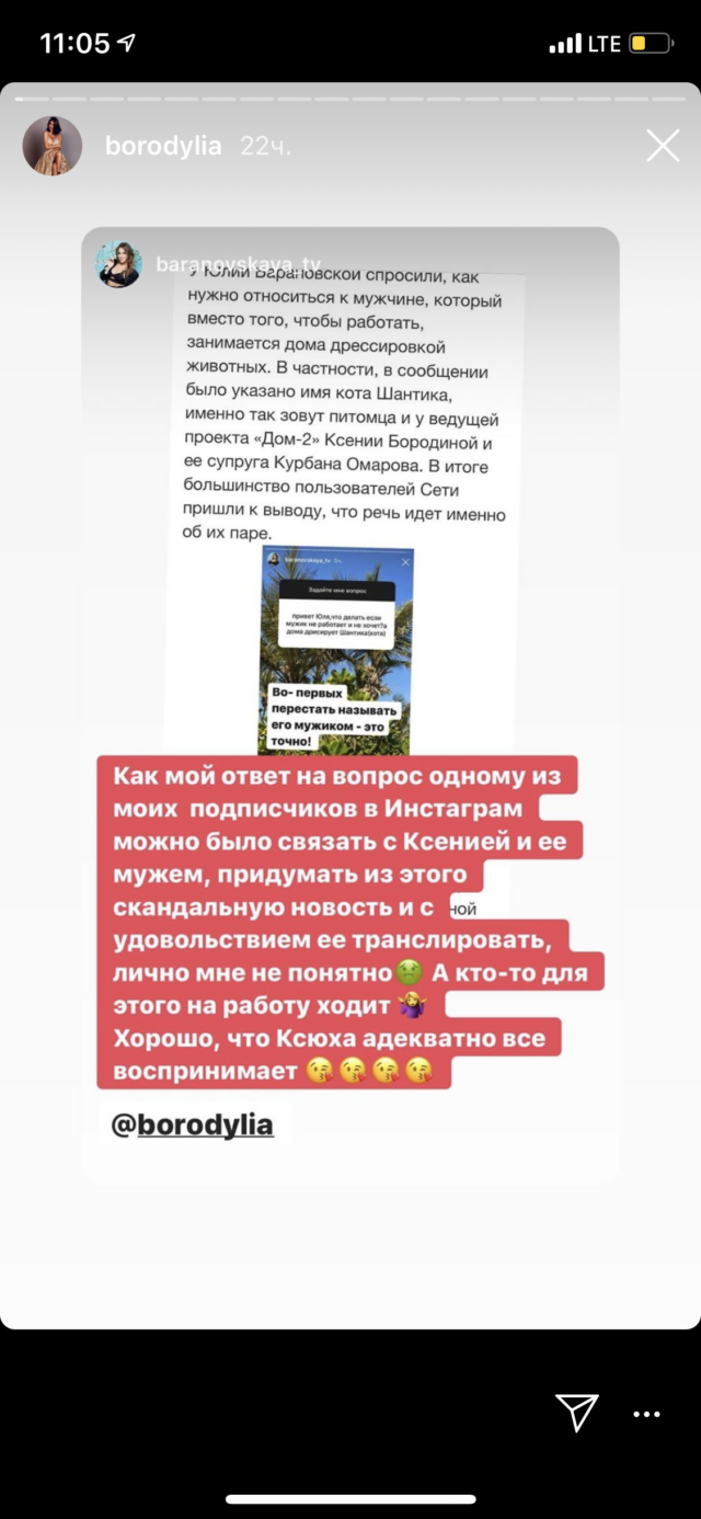 И Барановской пришлось лично обратиться с извинениями к Бородиной: «Ксюха, привет! Я пишу извиниться за чушь и нелепость нерадивых журналистов.Мне, правда, очень стыдно, что мой ответ на простой вопрос в Инстаграме связали с вами. Как ты понимаешь, я никогда в жизни не писала про твою жизнь. Хочу извиниться за ситуацию», — написала Юлия. Ксения заверила коллегу, что все прекрасно понимает и знает, что у той и в мыслях не было говорить плохо про ее семью.