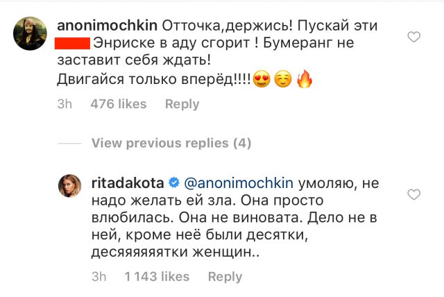 А теперь, кажется, и мы знаем одну из донжуанского списка певца. Дакота выложила пост, в котором рассказала, что переживает после разрыва с бывшим возлюбленным, и один из пользователей написал в комментариях: «Пускай эта су** Энриске в аду сгорит! Бумеранг не заставит себя ждать! Двигайся только вперед» (Энриске — по названию профиля @enrickie).
