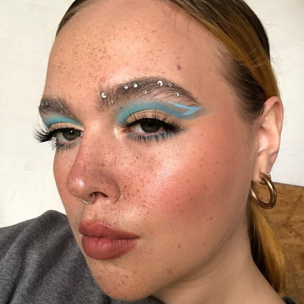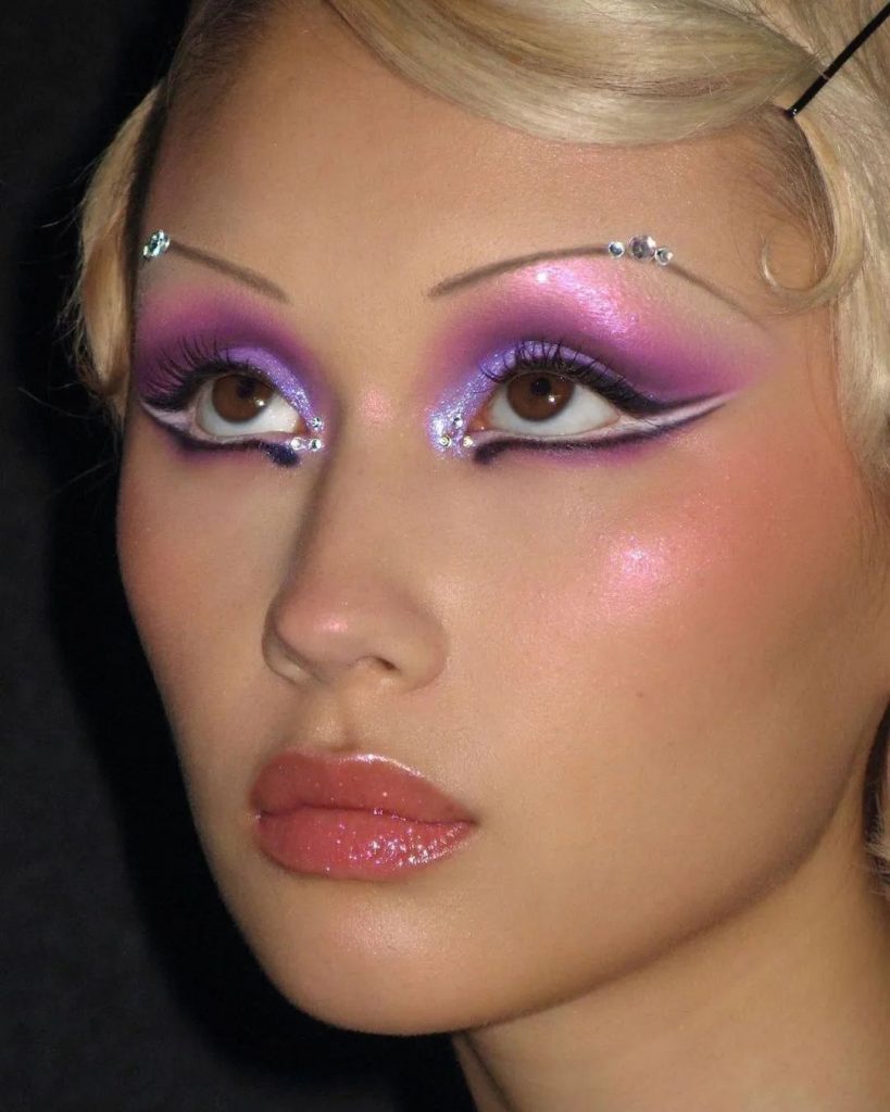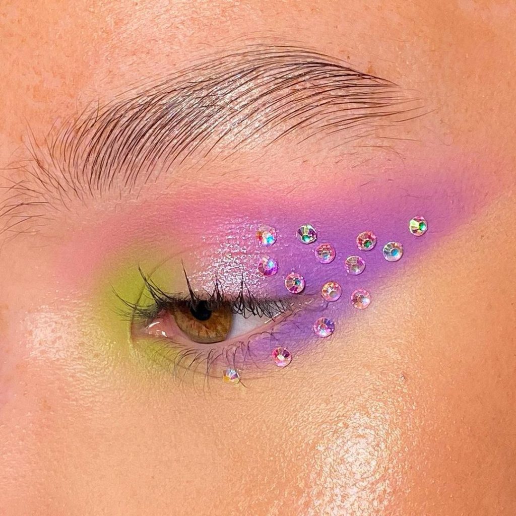 Если заменить хайлайтер, который ты наносишь во внутренний уголок глаза, на стразы, макияж сразу станет интересным и запоминающимся. Бери пример с Дуа Липы, которая появилась с лиловыми тенями и прозрачными мерцающими камнями на фестивале Primavera Sound в Барселоне.