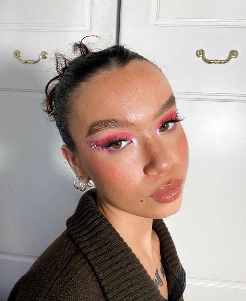 Стразы в качестве дополнительного элемента к макияжу глаз — хороший способ придать ему более праздничный вид. Добавь россыпь прозрачных кристаллов на все веко, как это делала визажистка «Эйфории» Донни Дэви, или выложи их в форме дуги от внешнего уголка глаза до брови.