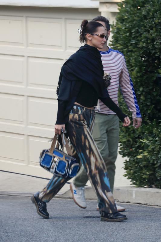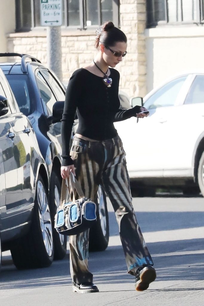 Модель часто демонстрирует стильные и непривычные образы еще до того, как это станет трендом. Накануне Белла вышла на прогулку в брюках тай-дай на низкой посадке и с винтажной сумкой из нулевых. Уверены, скоро подобные аксессуары будут носить все модницы.
