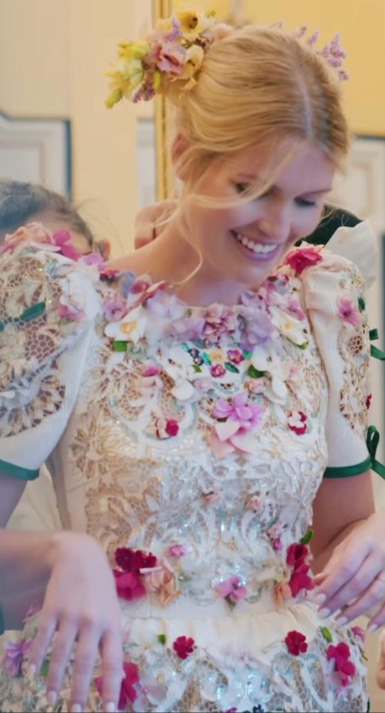 На самой церемонии племянница Дианы появилась в белом кружевном платье с высоким горлом и винтажными пуговицами, которое напомнило образ ее матери, Виктории Эйткен (она надела его в 1989 году на свадьбу с Чарльзом Спенсером).