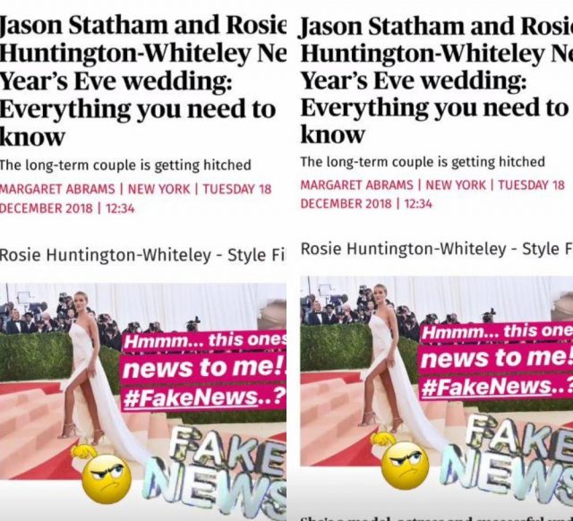 На днях в Сети снова появились заголовки о скорой свадьбе Уайтли и Стэтхема. Модель выставила скриншот одной из статей и написала у себя в Stories «неправдивые новости» (Fake news).