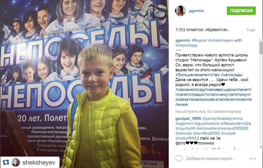 О таком радостном событии сообщила Юлия, поделившись записью продюсера Петро Шекшеева (42), который опубликовал фото Артема и написал: «Приветствуем нового артиста школы студии "Непоседы": Артём Аршавин! Ох, верю, что большой артист вырастет из этого мальчишки!»