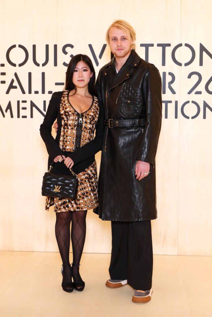 Лукас пришел в черном кожаном плаще, свободных брюках и кедах, а Эрин твидовом платье и черных босоножках. Пара выглядела расслаблено и непринужденно.