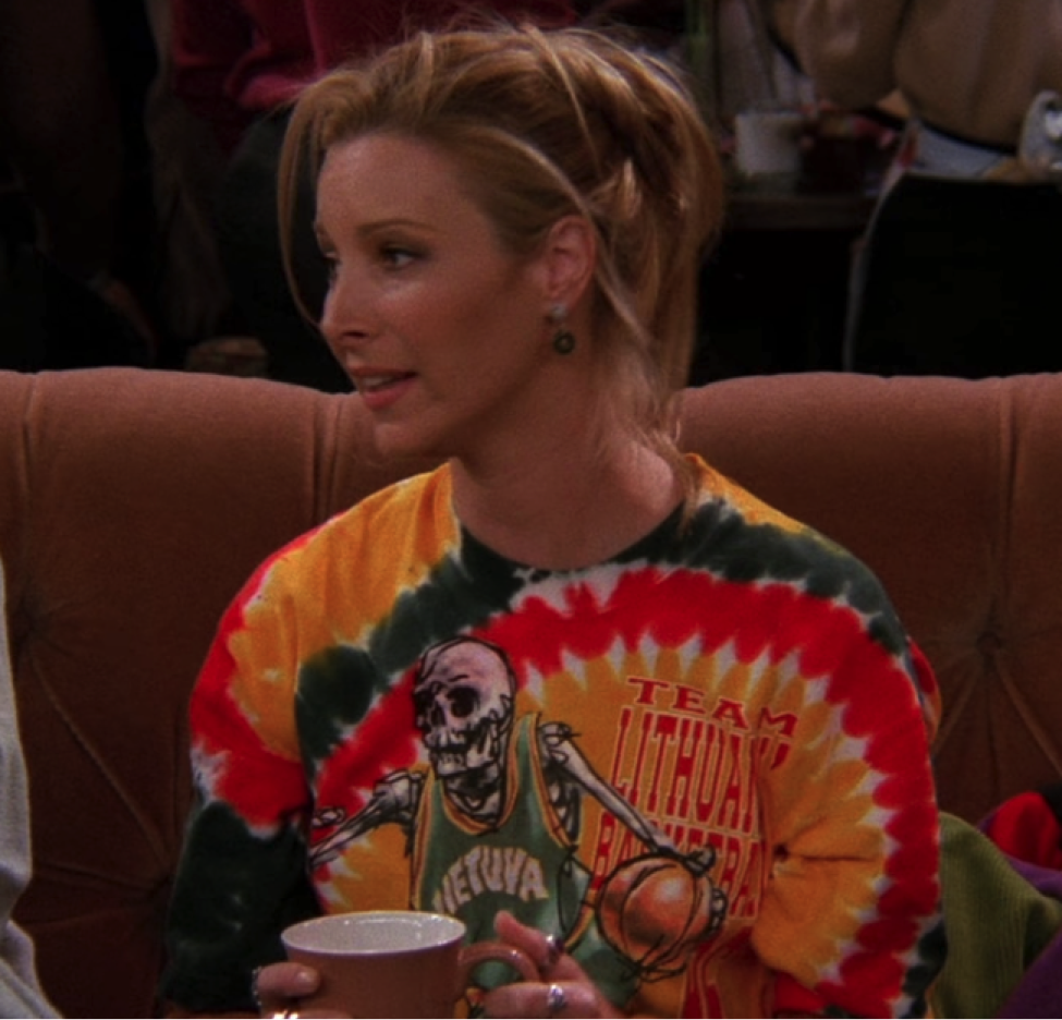 Фиби носила тай-дай еще до того, как это стало главной фишкой всех тиктокеров. Кстати, в такой футболке пару раз появлялась и Рэйчел. Она носила модель Juicy Couture.