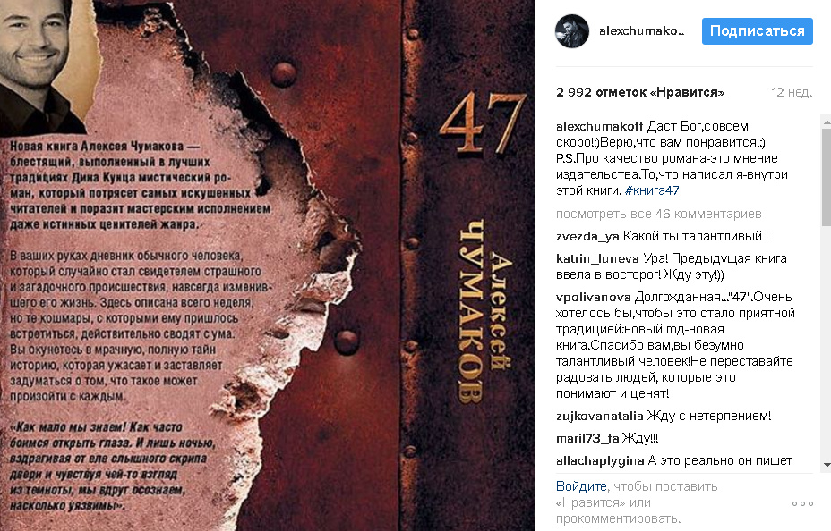 А теперь артист представляет новую книгу под загадочным названием «47», которая тоже написана в жанре фантастики.
