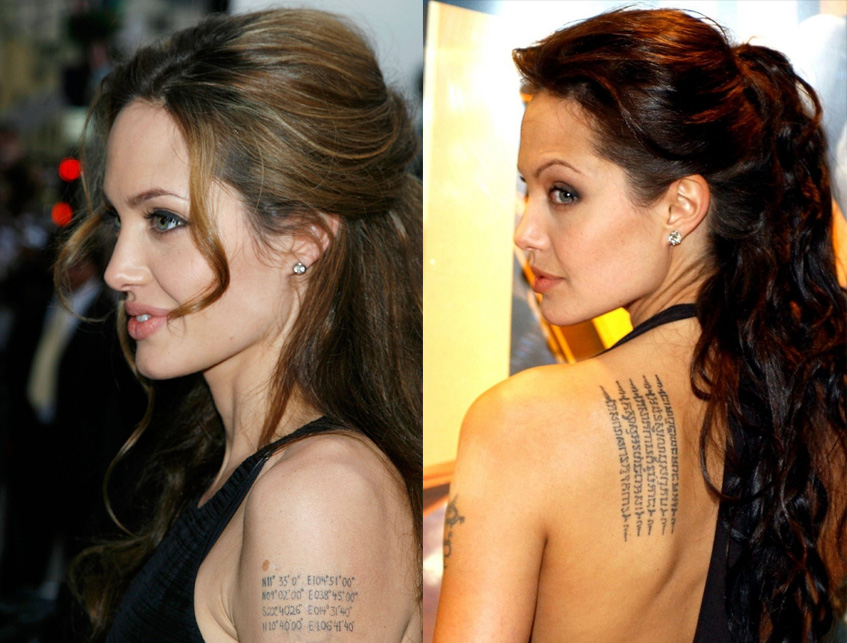 То, что Джоли набивает татуировки с сакраментальным значением, известным ей одной, знает весь мир. Но доподлинно известно, что на левом плече актрисы набиты координаты мест рождения ее детей.