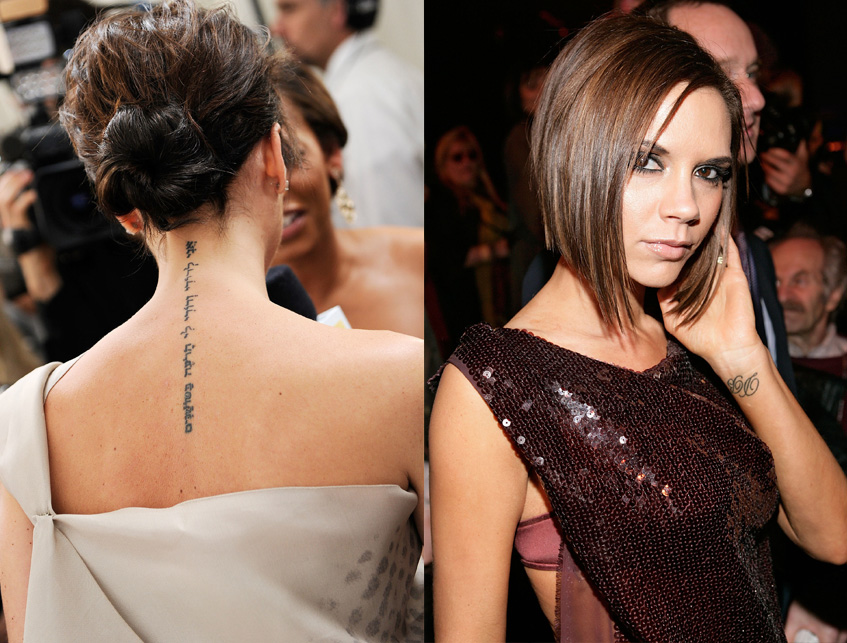 «Мой мужчина принадлежит мне, а я принадлежу своему мужчине», — гласит тату супруги Дэвида. Тело Виктории украшает еще один рисунок, посвященный мужу – его инициалы на запястье.