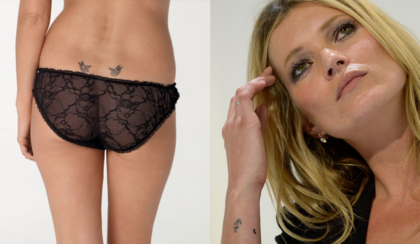 Тату Мосс в виде двух ласточек стала одной из самых дорогих татуировок в мире, ведь набивал ее художник Люсьен Фрейд! А на запястье Кейт красуется маленький якорь.
