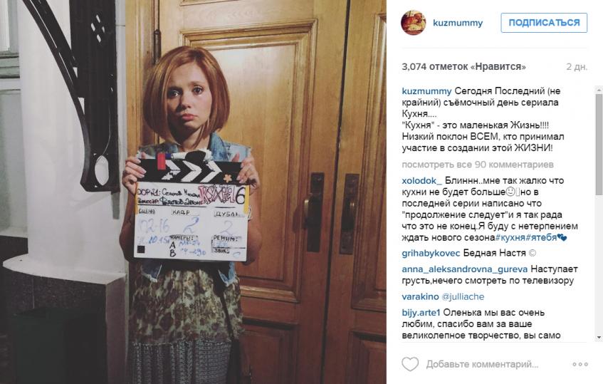 Об этом рассказала поклонникам актриса Ольга Кузьмина (28), опубликовав в Instagram фото с подписью: «Сегодня Последний (не крайний) съёмочный день сериала Кухня…. "Кухня" — это маленькая Жизнь!!!! Низкий поклон ВСЕМ, кто принимал участие в создании этой ЖИЗНИ!»