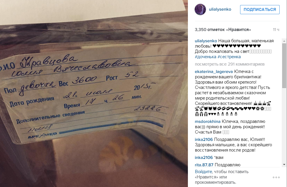 Об этом своим поклонникам телеведущая рассказала, опубликовав фотографию родильной бирки в Instagram. Малышка весом 3600 граммов и ростом 52 см родилась вечером 21 июля. Сама же Юлия добавила: «Наша большая, маленькая любовь! Добро пожаловать на свет».