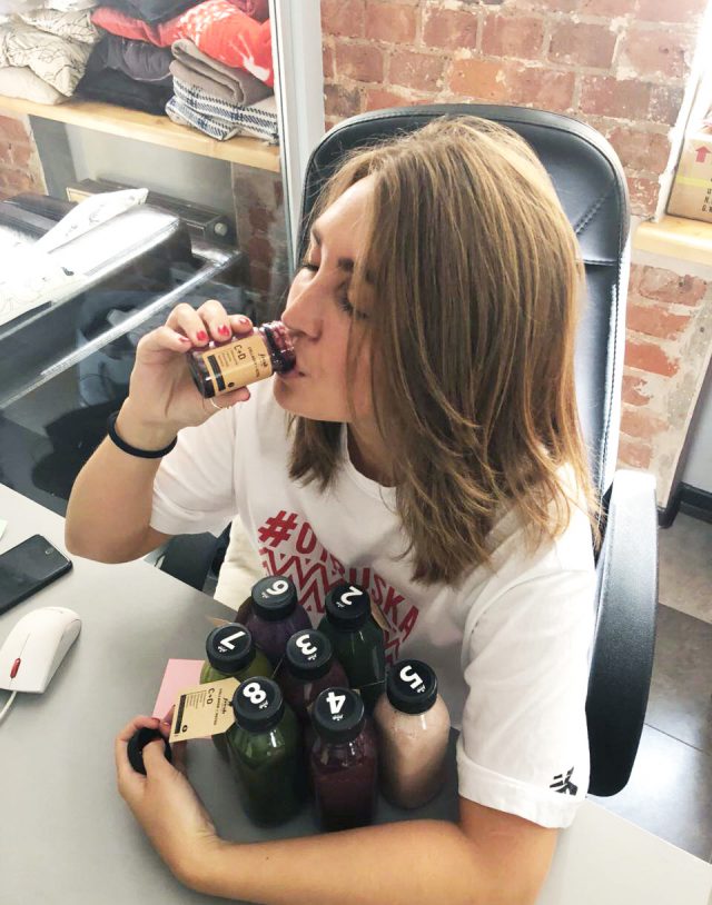 Я никогда до этого не пробовала детокс и вначале вообще думала, что выдержать три дня на соках – это нереально. Я выбрала черный день, зеленый и Sexy health. Самым вкусным из них был Sexy health, в этот день входит даже яблоко, поэтому он был еще и самым сытным. Самый невкусный – зеленый, особенно первый шот и хлорелла, которую нужно пить весь день. Но мне кажется, что он один из самых полезных, поэтому противный вкус можно и потерпеть. Приятным бонусом было то, что за эти три дня я похудела чуть больше чем на два килограмма. А после детокса чувство голода значительно уменьшилось, и я стала намного меньше есть. Так что, если вы никак не можете сесть на диету или правильно питаться, детокс – это отличное начало. Главное – выдержать эти три дня! Лучше проводить детокс с коллегами, семьей или друзьями – вместе легче. Мне кажется, мы выдержали только потому, что почти всей редакцией сидели на детоксе одновременно.