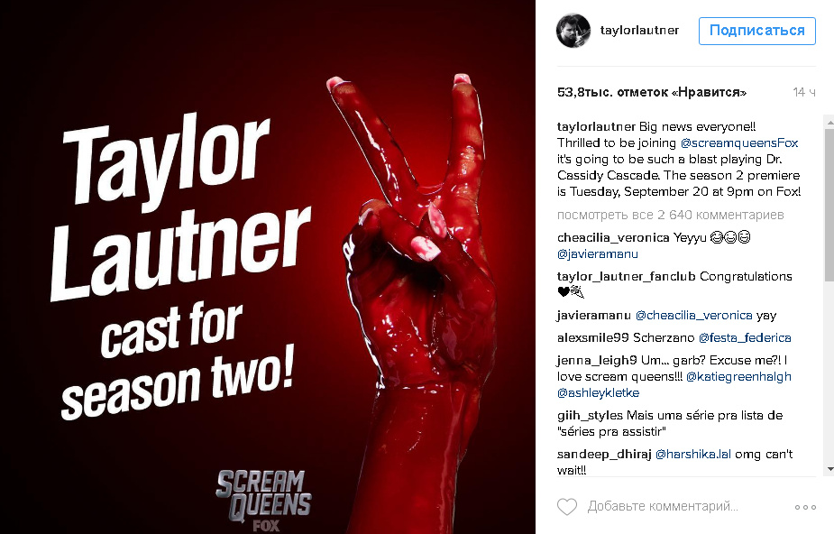 Теперь Лотнера ждет еще один громкий проект. Вчера в своем Instagram он поделился официальным постером комедийного сериала «Королевы крика», к которому он присоединится во втором сезоне!