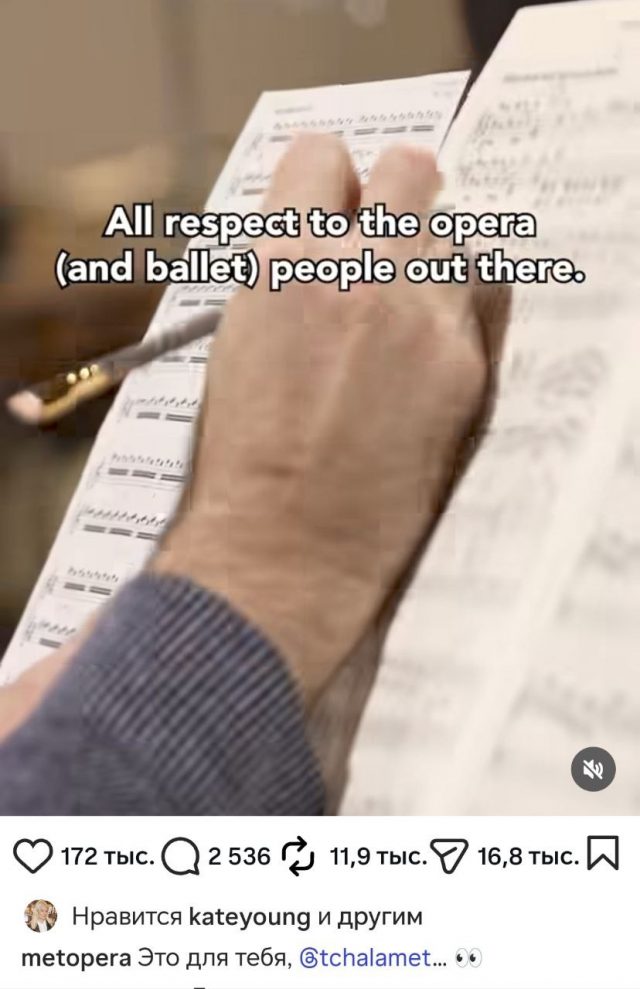 После Тимоти раскритиковали Лос‑Анджелесская и Метрополитен‑опера в Нью‑Йорке. Последняя опубликовала видео, на котором показала, как сложно работать в опере, и сопроводила пост подписью: «Это для тебя, Тимоти Шаламе».