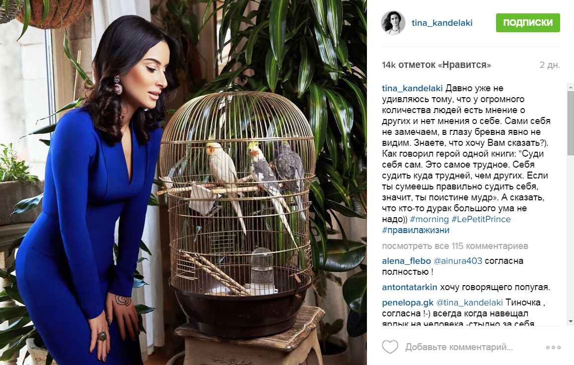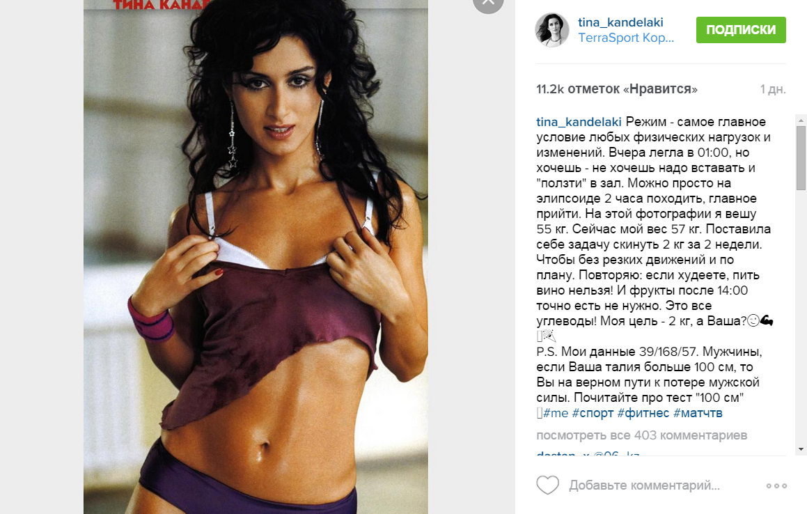 В той же записи Тина поделилась своими нынешними параметрами и дала ценный совет мужской части своих поклонников: «Мои данные 39/168/57. Мужчины, если Ваша талия больше 100 см, то Вы на верном пути к потере мужской силы. Почитайте про тест "100 см"».