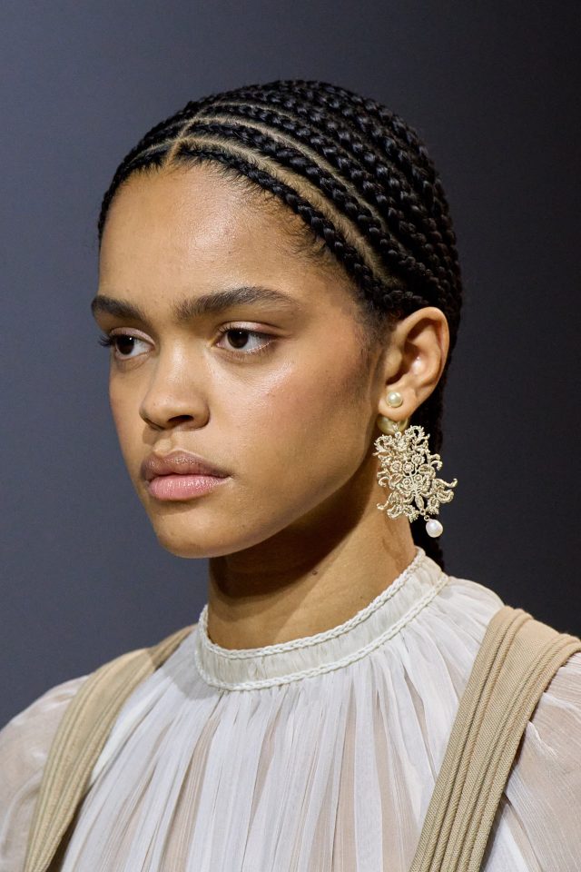 Дизайнеры Chanel, Armani Prive, Iris van Herpen и не только сделали ставку на тонкие косички, обрамляющие кожу головы под разными углами – как горизонтально, так и вертикально. Причем помимо оммажей классическим этническим элементам, мы видели и другие, более «минималистичные» вариации – внимание на прически с показа Elie Saab. Настоящую волю фантазии дала нидерландский модельер Ирис ван Херпен: стилисты по волосам, работавшие на показе, решили пойти ва-банк, сделав из косичек своеобразные гребни и переместив элементы на среднюю треть лица и уши моделей.