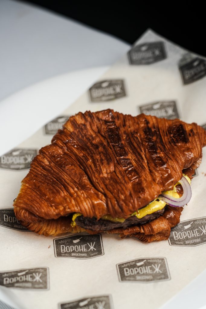 Для любителей французской эстетики есть смэш-круассаны. Внутри: сочная плоская котлета, свежий красный лук, маринованные огурцы, сыр чеддер и фирменный соус барбекю.