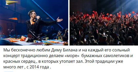 Не менее впечатляющи и флешмобы на концертах Димы Билана. Красные сердца и самолеты, уже ставшие традиционными элементами шоу, создают в зале особую атмосферу единения.