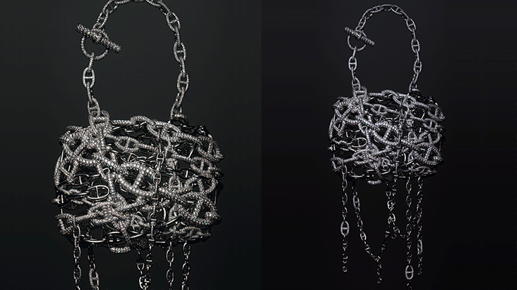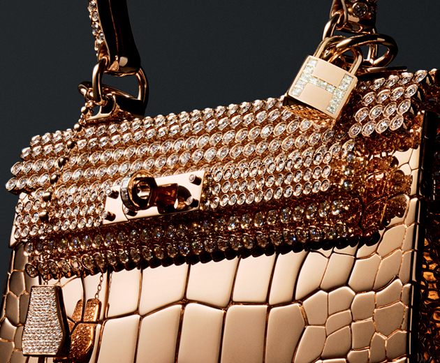 Две культовые модели модного дом Hermes были выпущены под чутким руководством Пьера Гарди специально для ювелирной линии Hermes’ Haute Bijouterie. Они полностью вылиты из розового и белого золота и инкрустированы 2712 бриллиантами. Но самое удивительное то, что размеры этой сумки невероятно малы. В нее даже не поместится твой телефон.