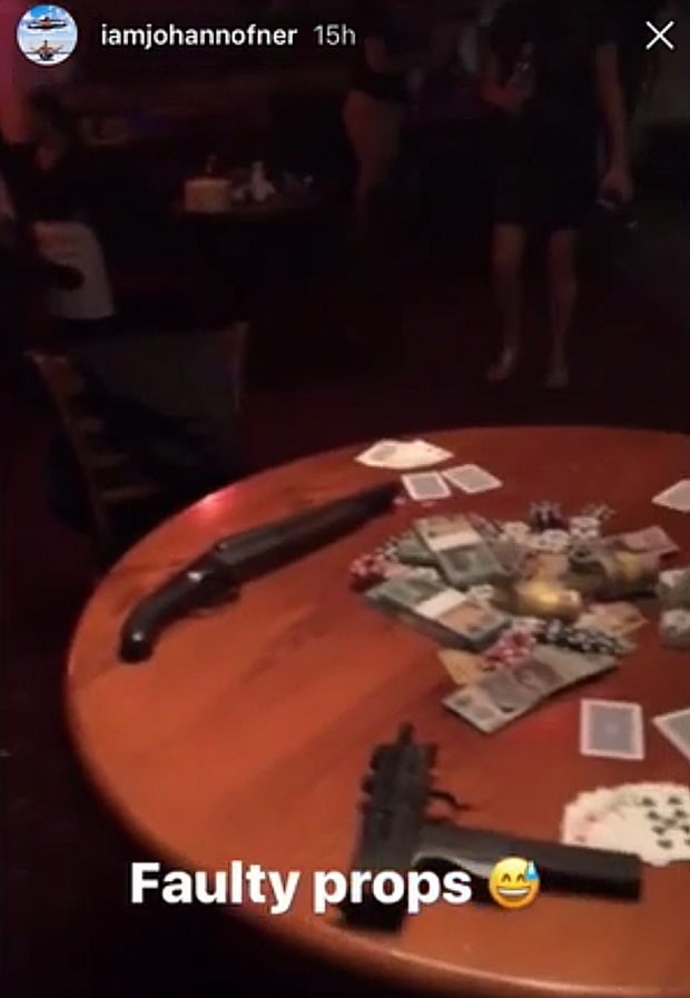 За несколько часов до происшествия Иоганн выложил в Instagram фото реквизита. На столе лежали два пистолета (как считали на площадке, фальшивые), деньги и игральные карты.