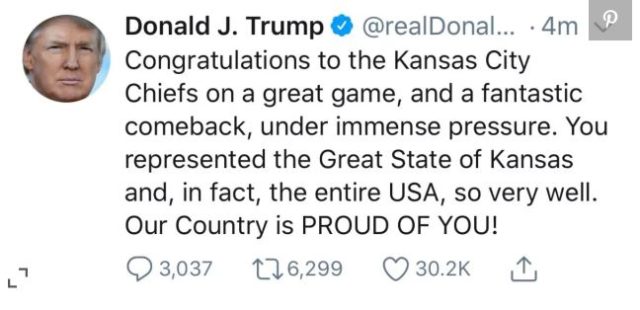 «Поздравляем вождей Канзас-Сити с великолепной игрой и фантастическим возвращением под огромным давлением. Вы очень хорошо представляли Великий штат Канзас и, по сути, весь США. Наша Страна — это ВЫ!» — написал Трамп в своем твите, который позже был удален.