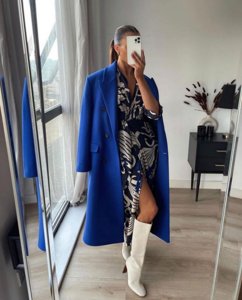 За последние несколько недель всю ленту Instagram заполнили фотографии пальто синего оттенка. It-girls предлагают носить тренд с кожаными черными брюками и базовой футболкой, высокими сапогами или платьем миди.