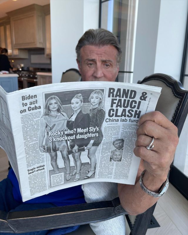 После показа Сильвестр опубликовал еще пару снимков с газетой с фотографией своих детей. «Интересно, где мои дочери были в последнее время? Кажется, я не могу их найти», – подписал публикацию актер.