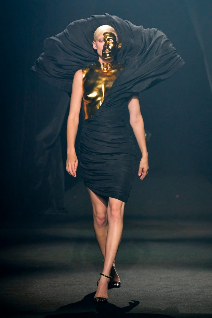 На подиуме мы увидели костюм Saint Laurent с массивной ярко-розовой бабочкой (читай главной визитной карточкой Эльбаза), черное миди Schiaparelli, дополненное золотым корсетом и маской, и летящее белое платье Lanvin (с этим модным Домом у Альбера были особые отношения), которое повторяет модель из линии 2008 года,