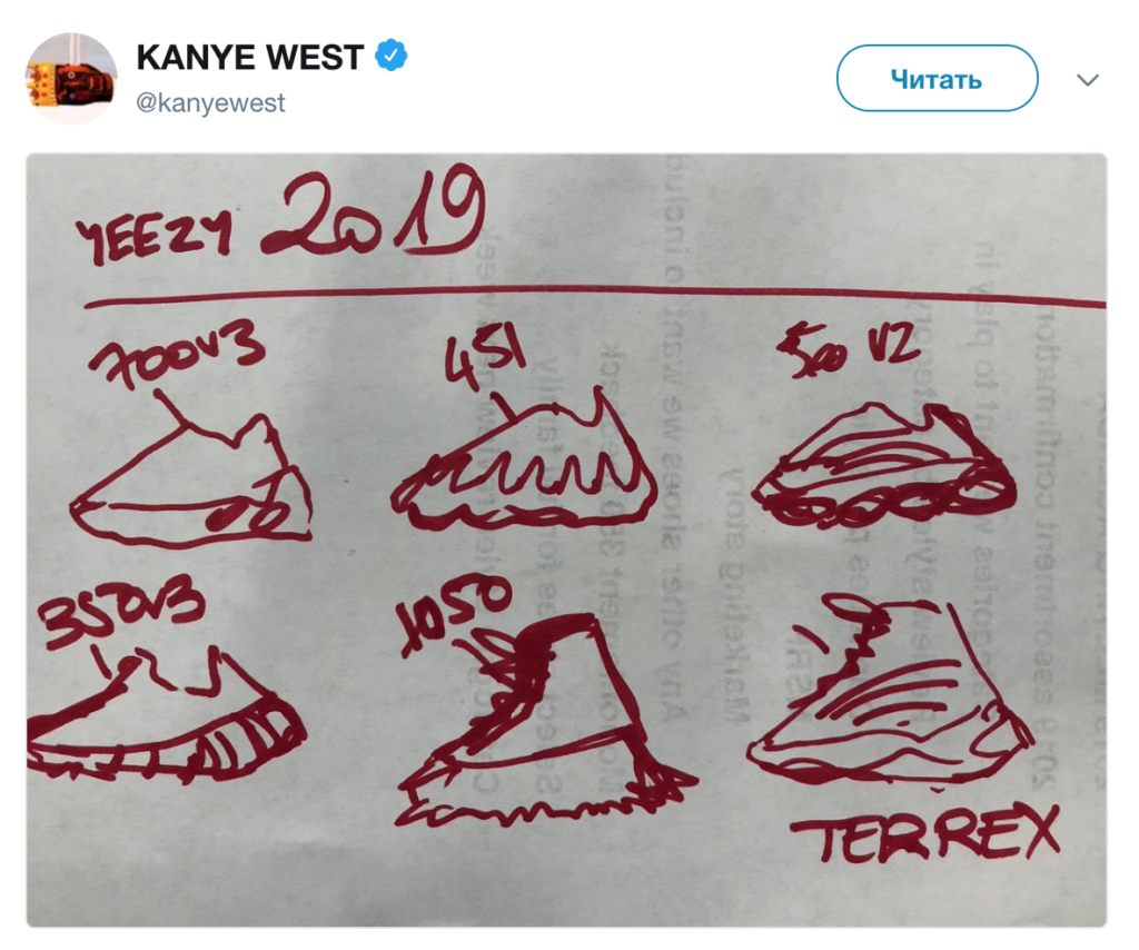 Кстати, для фанатов такой талант Канье стал настоящей неожиданностью. В Сети сразу вспомнили знаменитые эскизы кроссовок Yeezy, которые рэпер опубликовал в своём Twitter в 2018 году. Тогда подписчики с трудом узнали на рисунках кроссовки (некоторые даже предположили, что работы принадлежат Норт) и посоветовали рэперу больше не заниматься рисованием.