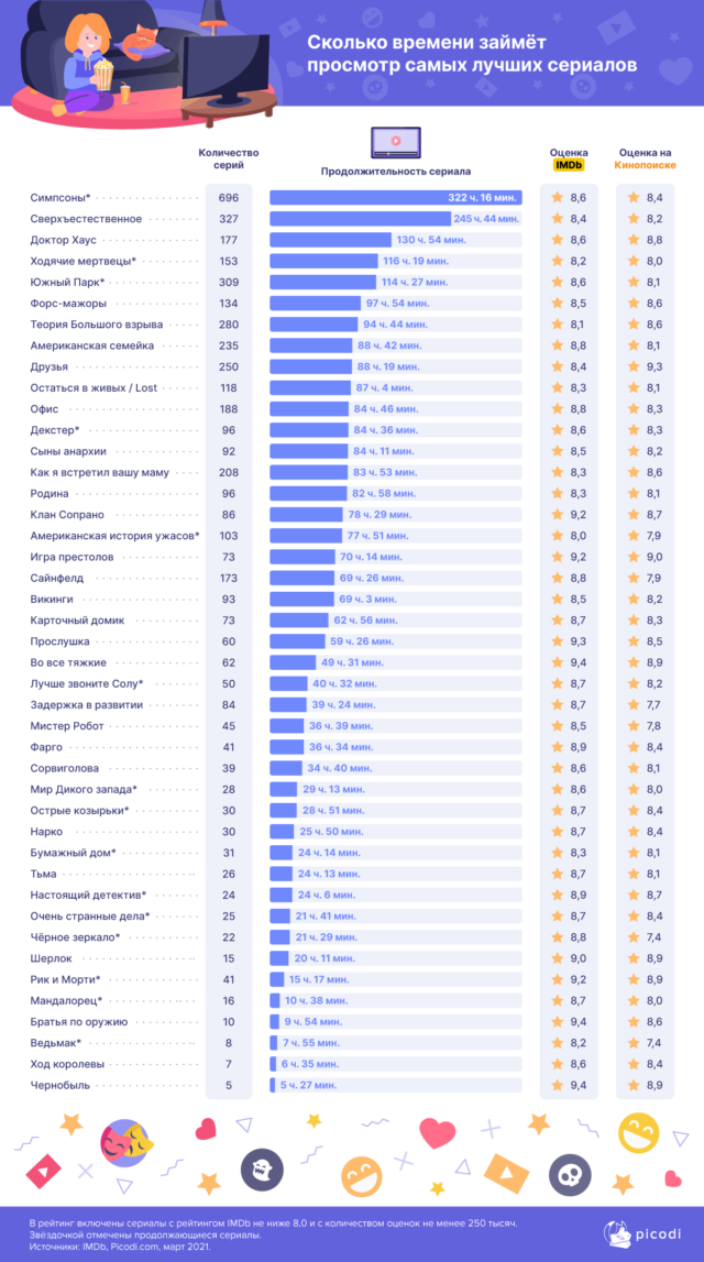 Аналитики из компании Picodi.com посчитали, сколько часов потребуется зрителям, чтобы полностью посмотреть тот или иной популярный многосерийный проект. В рейтинг они включили только те шоу, которые на IMDb имеют оценку не ниже 8 баллов.