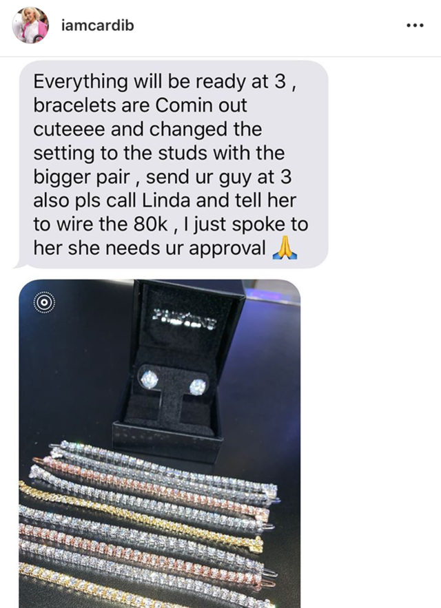 И на этом она останавливаться не планирует! Вчера Карди выложила в Instagram пост (позже она его, правда, удалила) с фотографией, на которой лежат несколько бриллиантовых браслетов и бриллиантовые сережки. А еще сообщение от ювелира, изготавливающего их, который писал: «Переводите 80 тысяч (5,1 млн рублей), я только что говорил с Линдой (судя по всему, ассистенткой Карди) и ей нужно ваше одобрение». Неплохо!
