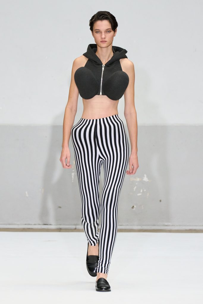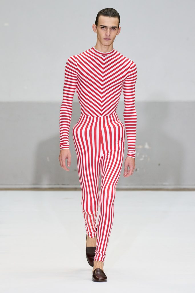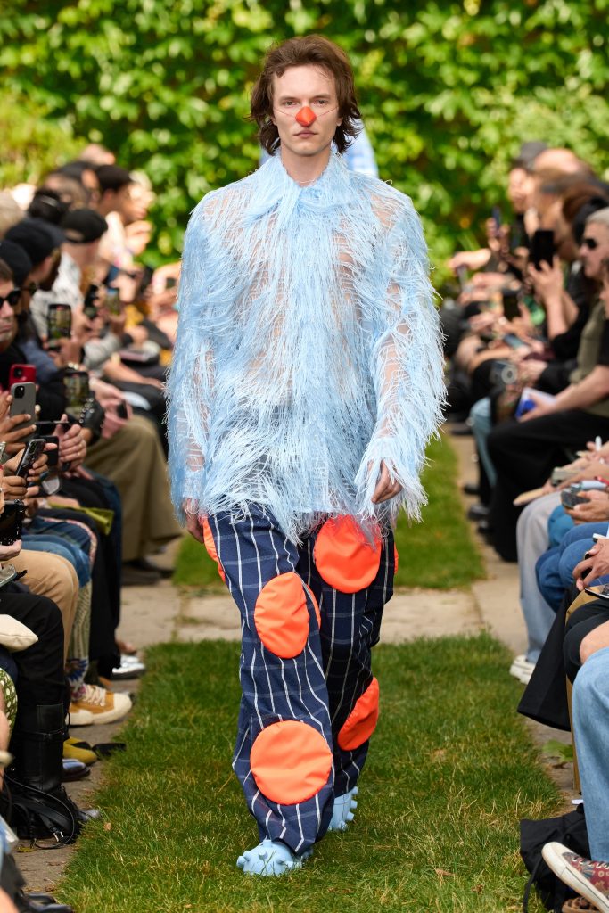 Да-да, эту эстетику точно не оценят приверженцы интеллектуального минимализма. Зато мы поддержим обеими руками. Тем более что на нашей стороне еще и дизайнерский цех. В весенне-летних коллекциях 2025 года мы видим очень много нарочито сюрреалистических вещей, намекающих на цирковую эстетику. К примеру, на подиум Kidsuper выходили модели в образе мимов в пестрых брюках, беретах и стереотипных жабо, а на показе Valter Van Beirendonck появились самые настоящие клоуны.