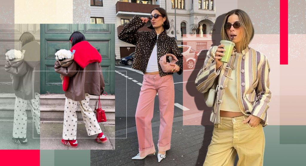 И, наконец, самый веселый вариант – цветные джинсы с принтом. В прямом смысле – двойное комбо. Полоска, принты, абстракция, цветочные мотивы, даже легкий градиент – деним больше не обязан быть однотонным.