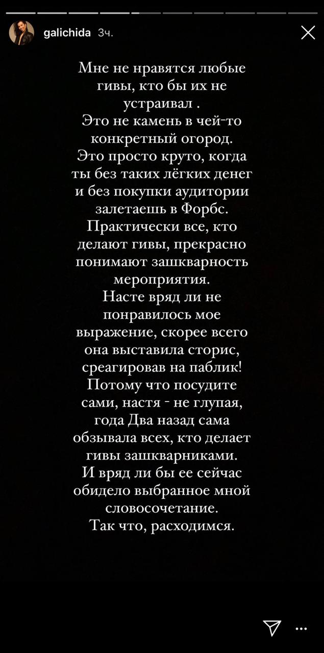 «Мне не нравятся любые гивы, кто бы их не устраивал. Это не камень в чей-то конкретный огород. Это просто круто, когда ты без таких легких денег и без покупки аудитории залетаешь в Форбс. Практически все, кто делают гивы, прекрасно понимают зашкварность мероприятия. Насте вряд ли не понравилось мое выражение, скорее всего она выставила сторис, среагировав на паблик! Потому что посудите сами, настя – не глупая, года Два назад сама обзывала всех, кто делает гивы зашкварниками. И вряд ли бы ее сейчас обидело выбранное мной словосочетание. Так что, расходимся (орфография и пунктуация автора – прим. ред.)», — написала Ида.
