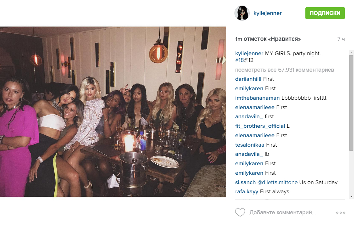 Присутствовали почти все представители легендарного шоу «Семейство Кардашьян», включая беременную Ким (34) со своим мужем Канье Уэстом (38), Кейтлин Дженнер (65) и Крис Дженнер (59). А молодой человек Кайли, рэпер Майкл Рэй Нгуен-Стивенсон (25), более известный под псевдонимом Tyga, поразил любимую роскошным подарком.