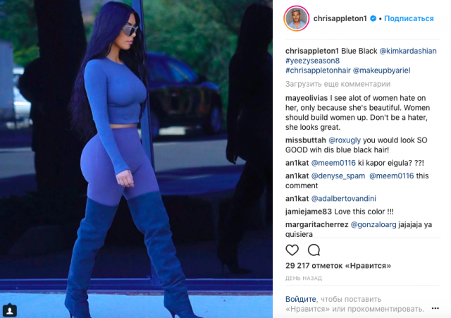 На днях Крис Эпплтон, любимый стилист Ким Кардашьян (37), выложил в свой Instagram фото, на котором у жены Канье Уэста (40) синие волосы. Что это – парик или реальное окрашивание, парикмахер не уточнил, но, скорее всего, это просто временный краситель, который быстро смывается, буквально за пару раз.