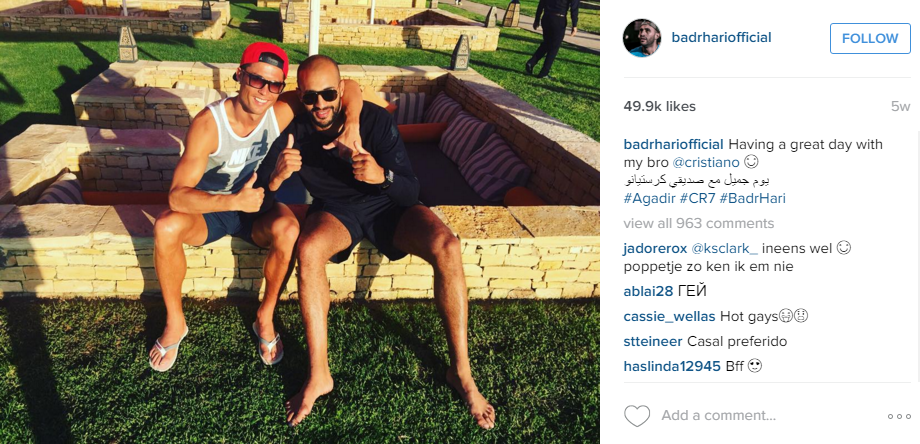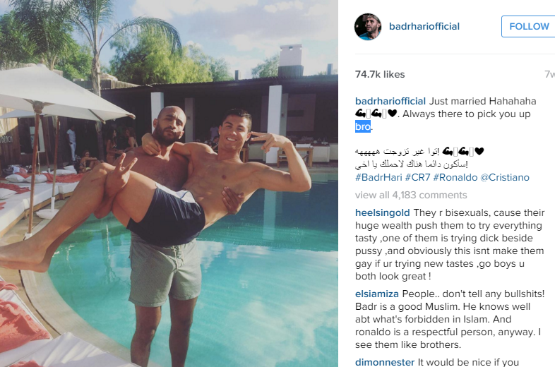 Ходили слухи, что Криштиану слишком много общается с кикбоксером из Морокко – Бадром Хари (31). Но слухи подтвердились, когда в сети появились фотографии, на которых кикбоксер носит своего любимого футболиста на руках и обнимает.